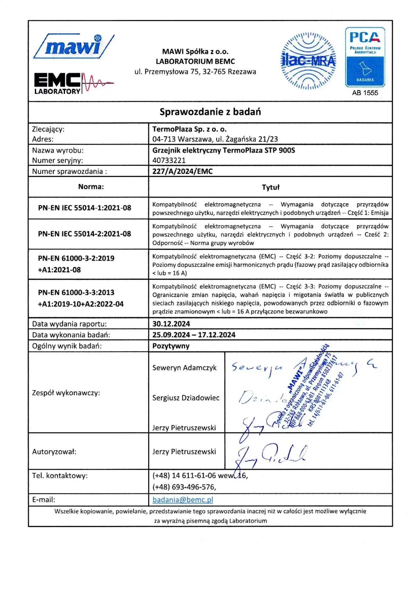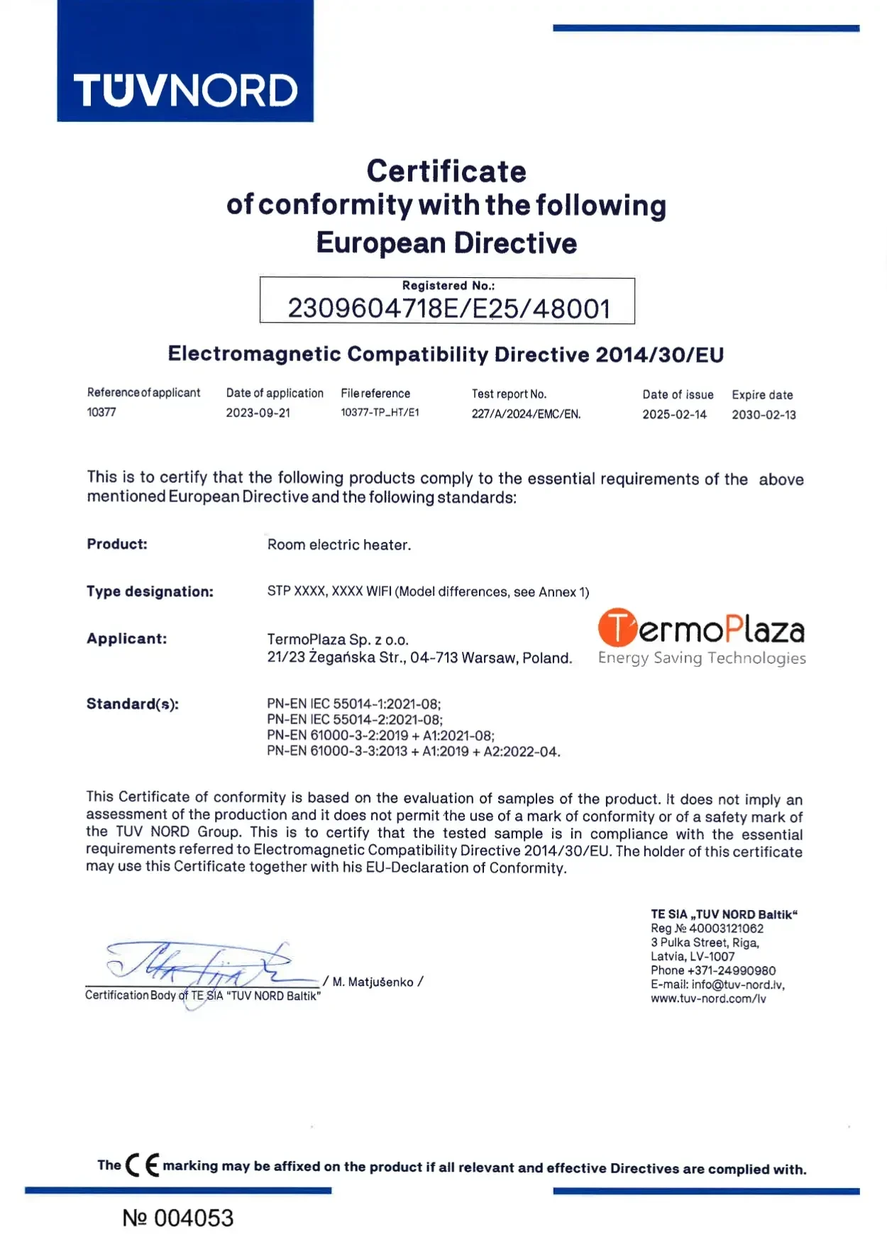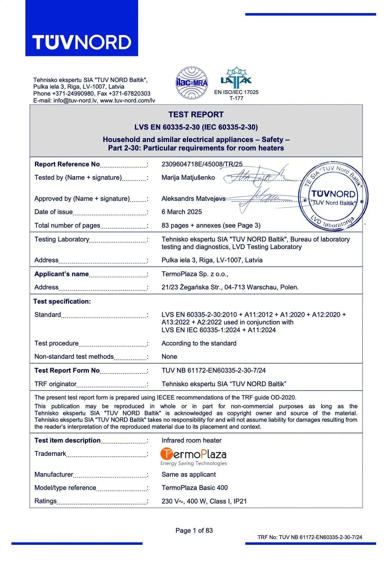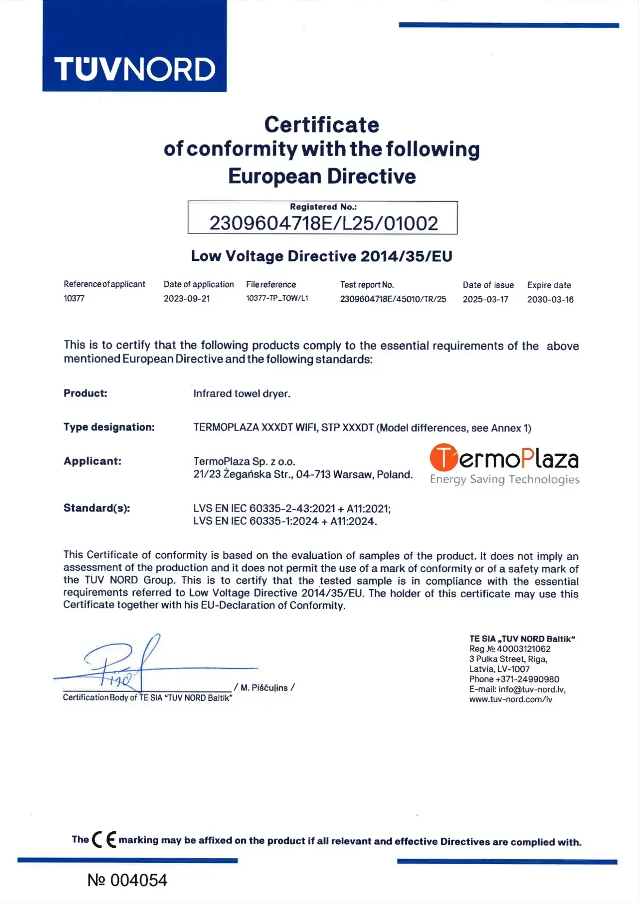 Panele grzewcze TermoPlaza posiadają certyfikat bezpieczeństwa wydany po testach TUV NORD Baltik – wiodącej jednostki notyfikowanej w UE. Potwierdza to spełnienie rygorystycznych norm unijnych w zakresie bezpieczeństwa, jakości oraz wydajności.